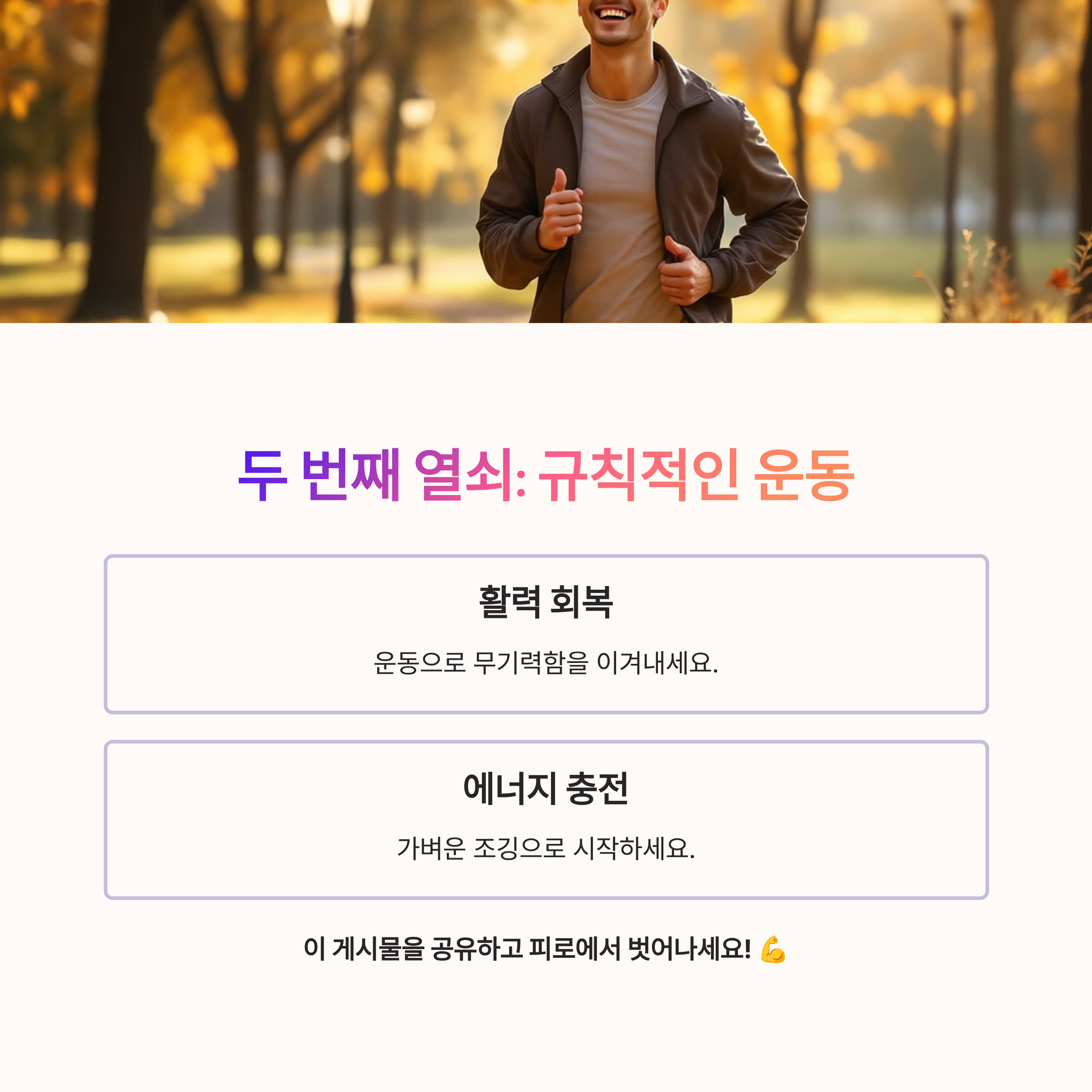 • 운동 효과: 규칙적인 운동은 혈액순환을 돕고, 에너지 생성 능력을 키우며, 숙면을 유도하는 최고의 피로회복제입니다.