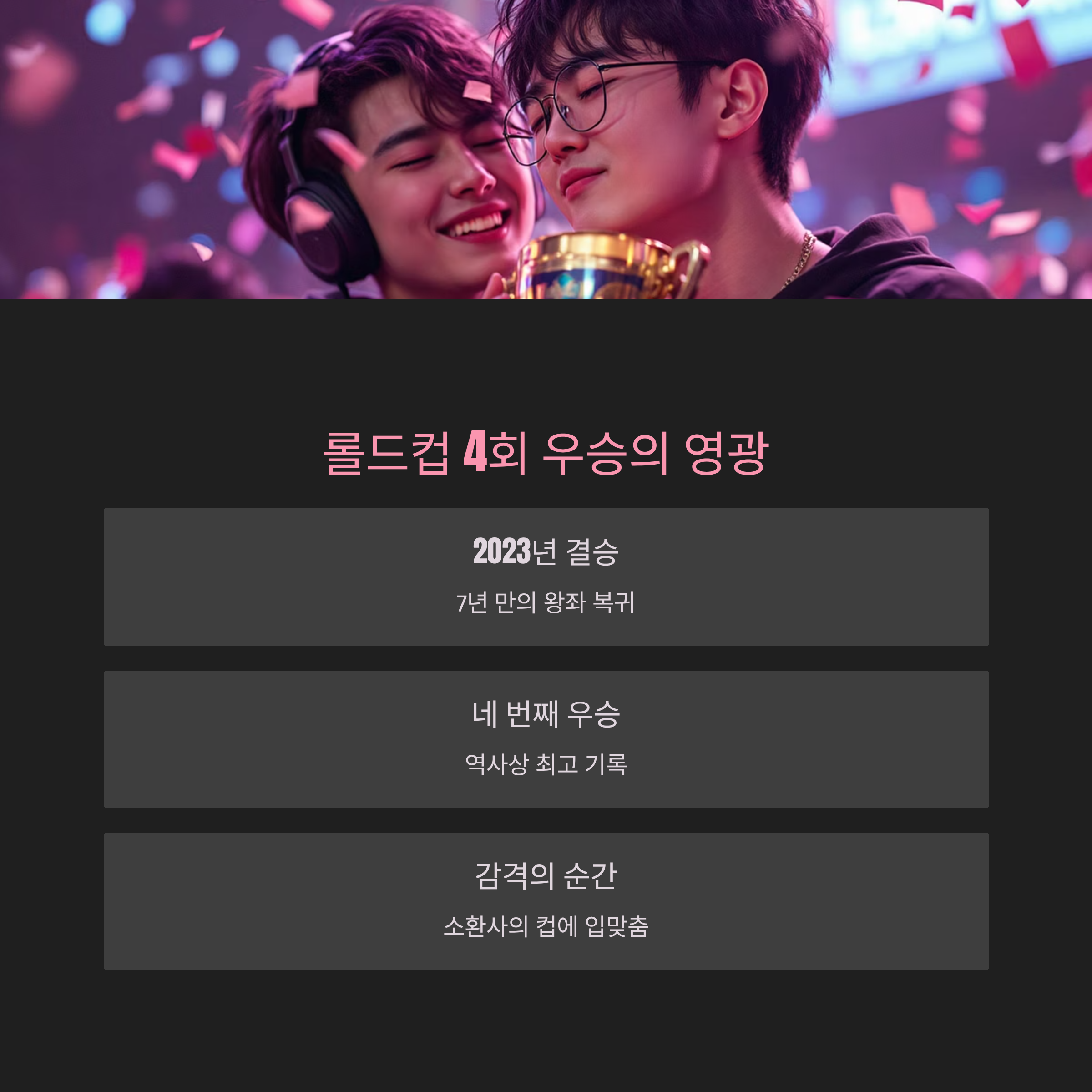 • 롤드컵(Worlds) 최다 우승: 4회 (2013, 2015, 2016, 2023)