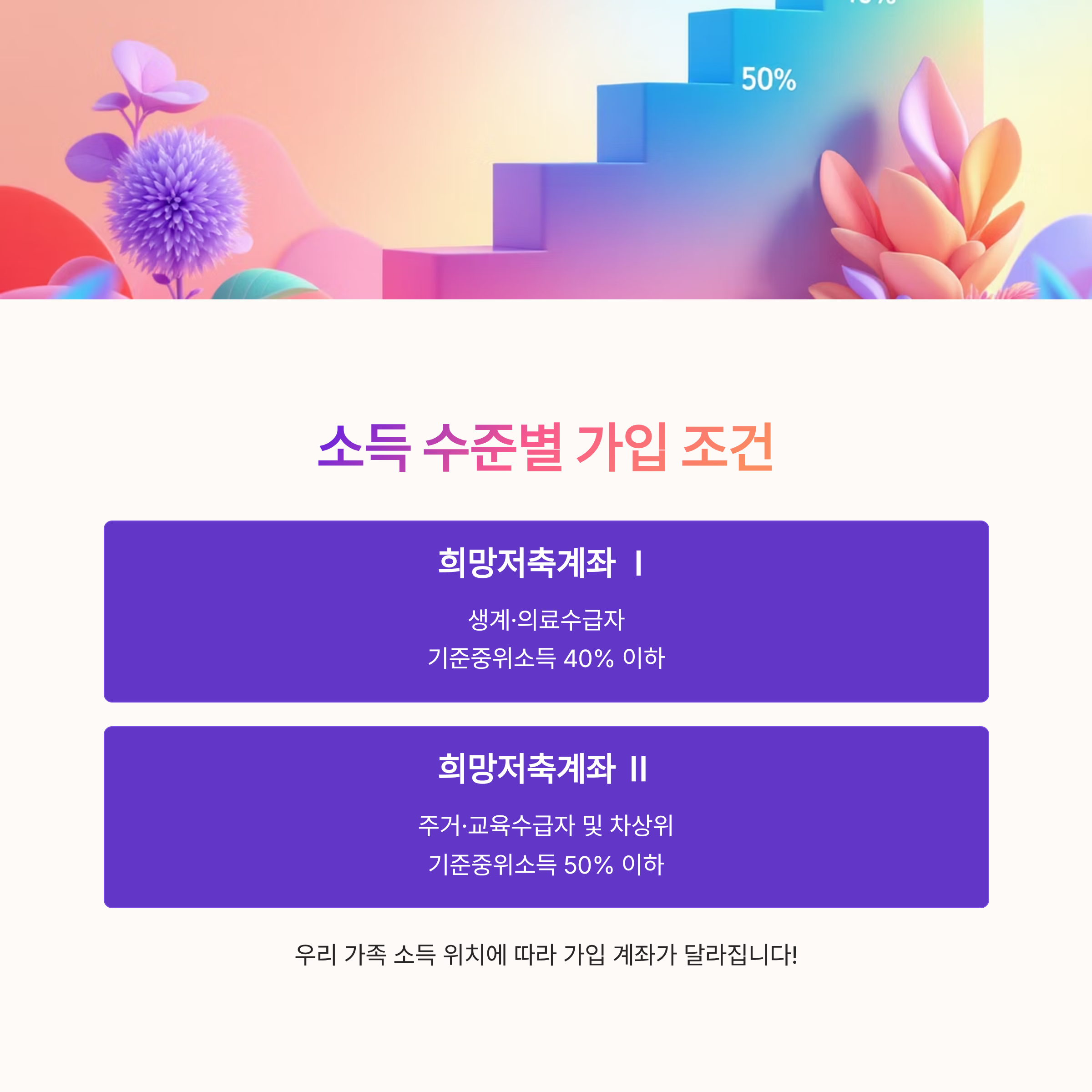 | 소득 기준 | 중위소득 40% 이하 | 중위소득 50% 이하 |