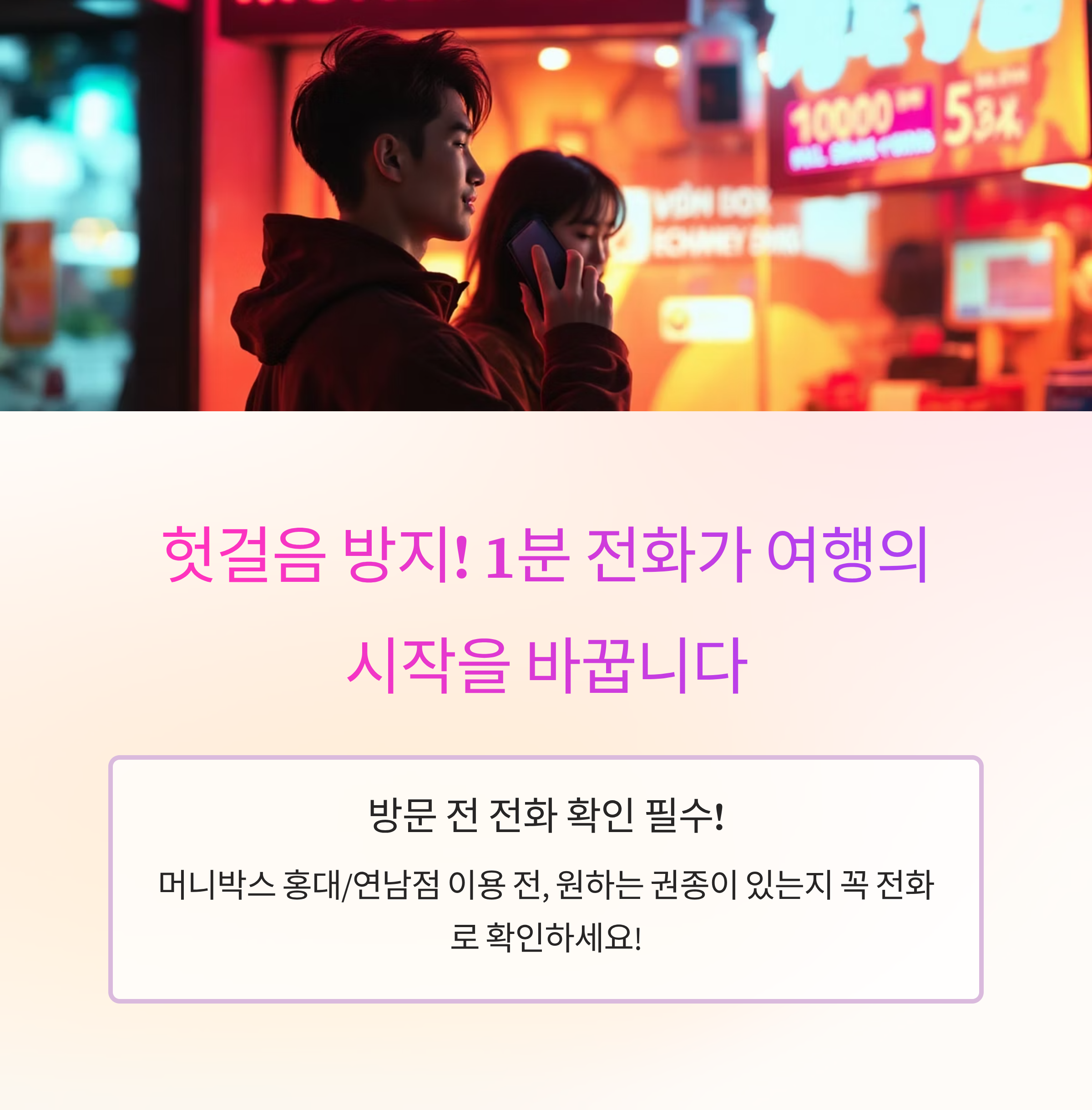 2. 머니박스 홍대/연남점 이용 시, 방문 전 전화로 권종 재고를 확인하는 것이 가장 중요합니다.