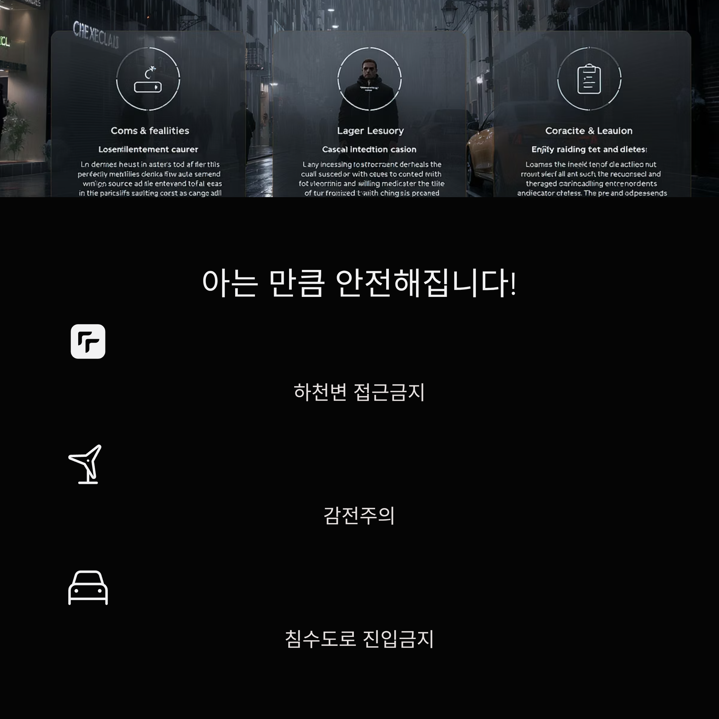 - 운전 중이라면 속도를 줄이고, 침수된 도로는 절대 진입하지 마세요. (물 높이가 타이어 절반만 차도 위험!)