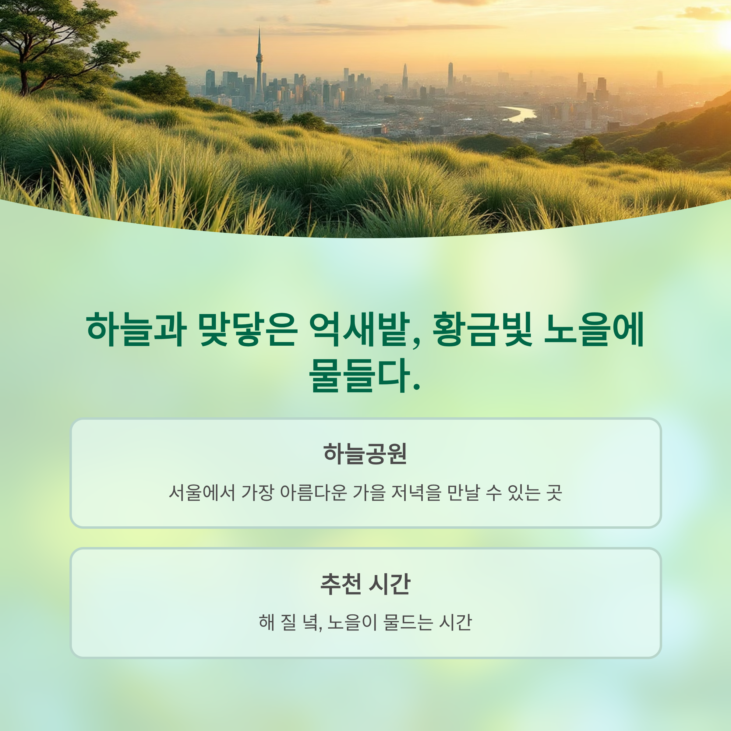 - 인생샷 포인트: 해 질 녘 '희망의 전망대'에서 서울의 야경과 억새를 함께 담아보세요!
