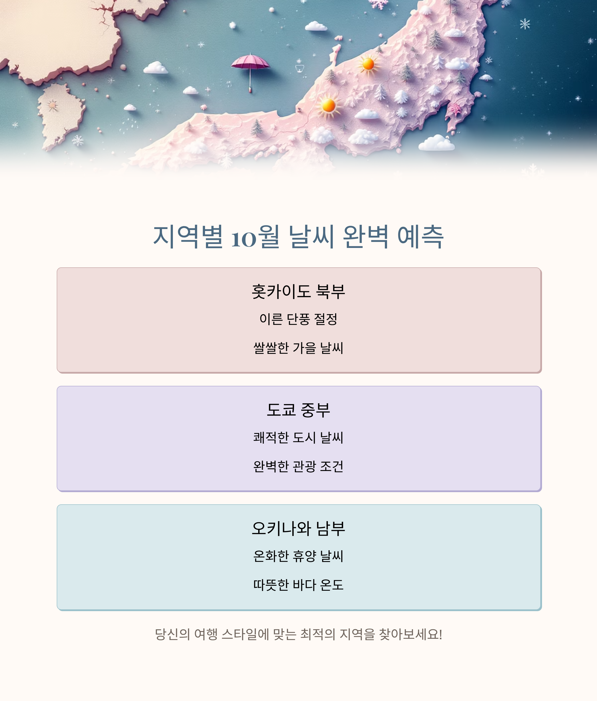 - **태풍:** 9월에 비해 태풍의 영향이 현저히 줄어들지만, 10월 초까지는 잔여 태풍이 일본 남부 해상에 영향을 줄 가능성도 있습니다. 여행 전 반드시 기상청 발표를 확인해야 합니다.