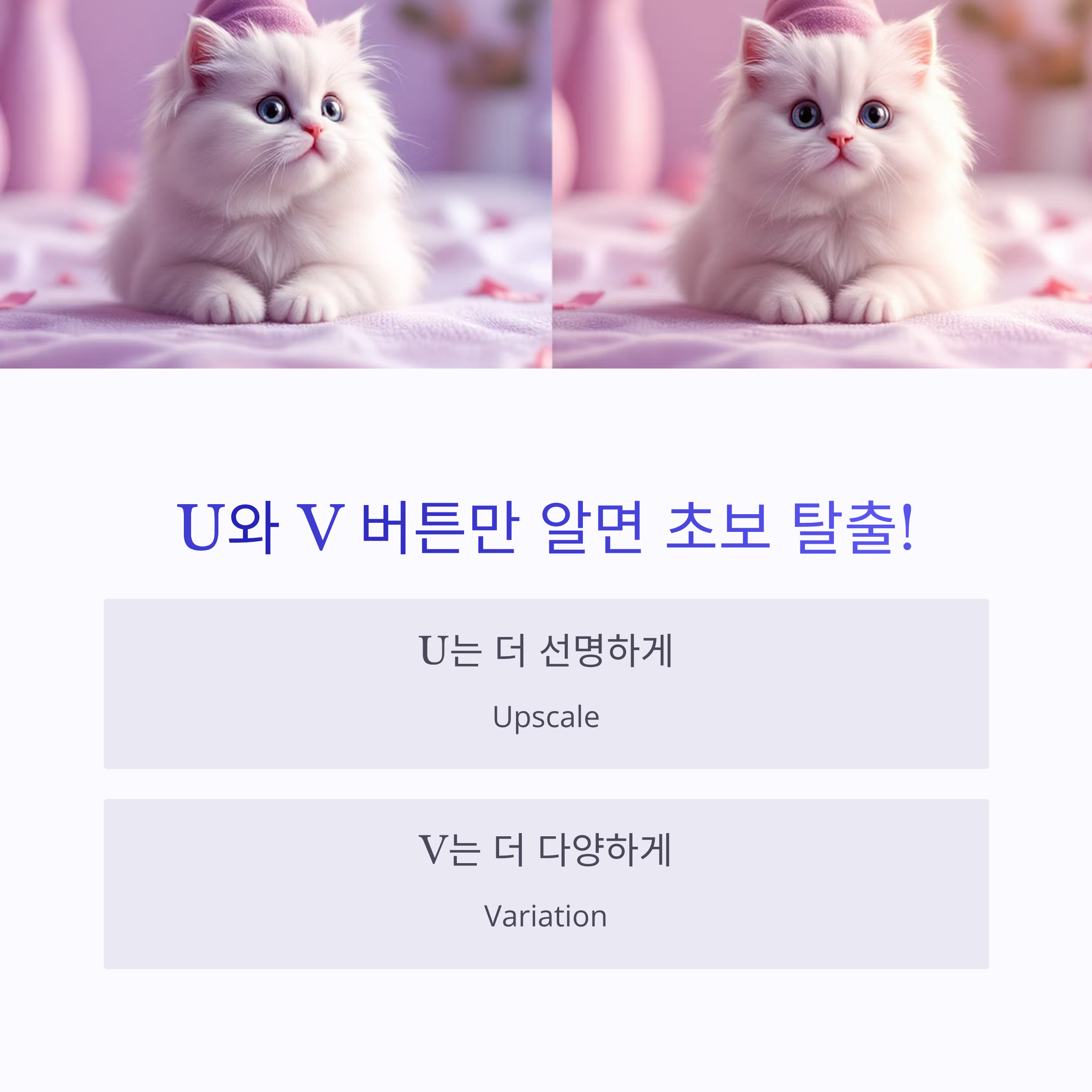 • U (Upscale): 선택한 이미지의 해상도를 높여 선명한 큰 이미지로 만들어줘요.
