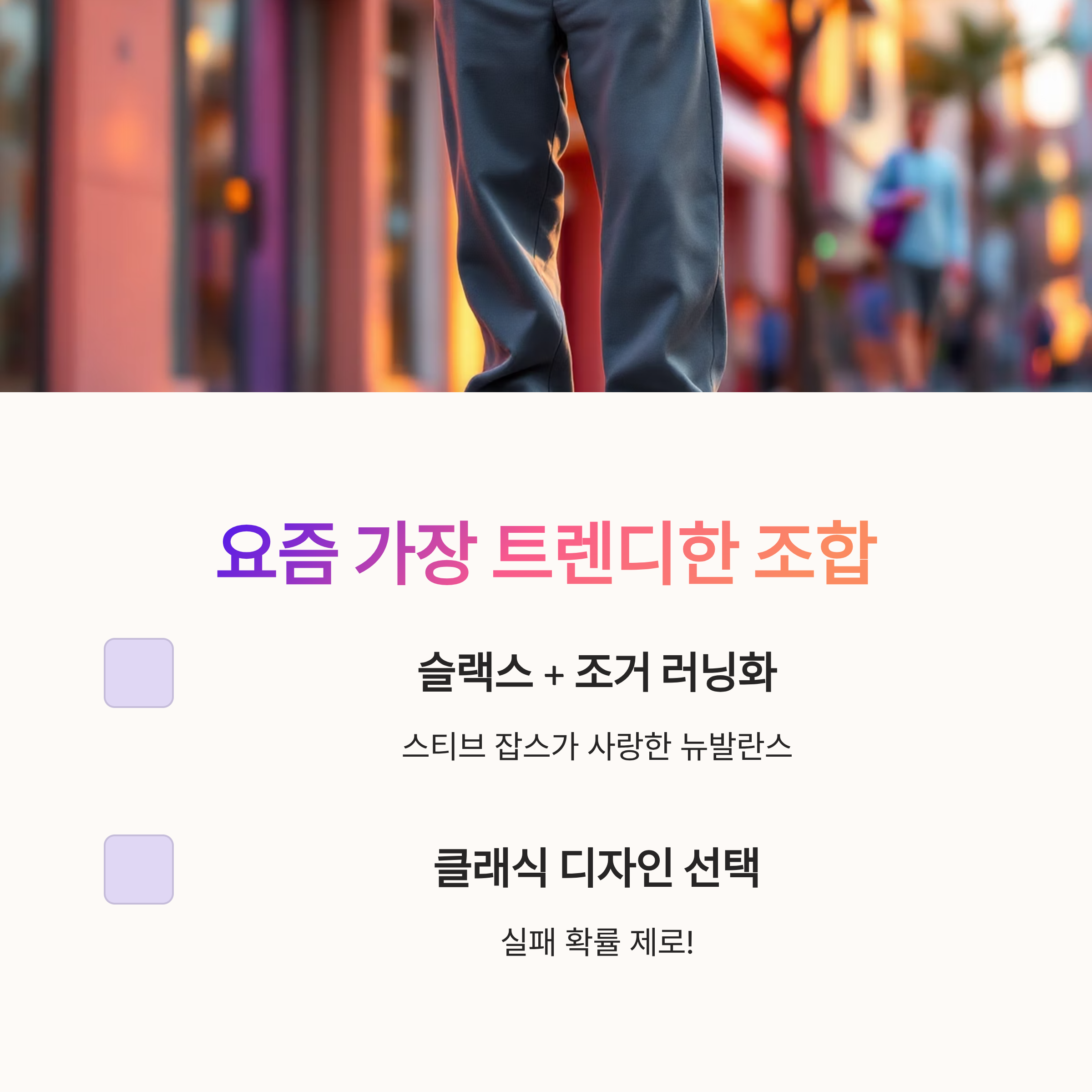 조거 러닝화: 너무 화려한 형광색이나 기능성 디자인이 강조된 러닝화는 자칫 '출근길 등산객'처럼 보일 수 있어요. 그레이, 네이비, 베이지 등 톤 다운된 컬러가 안전합니다.