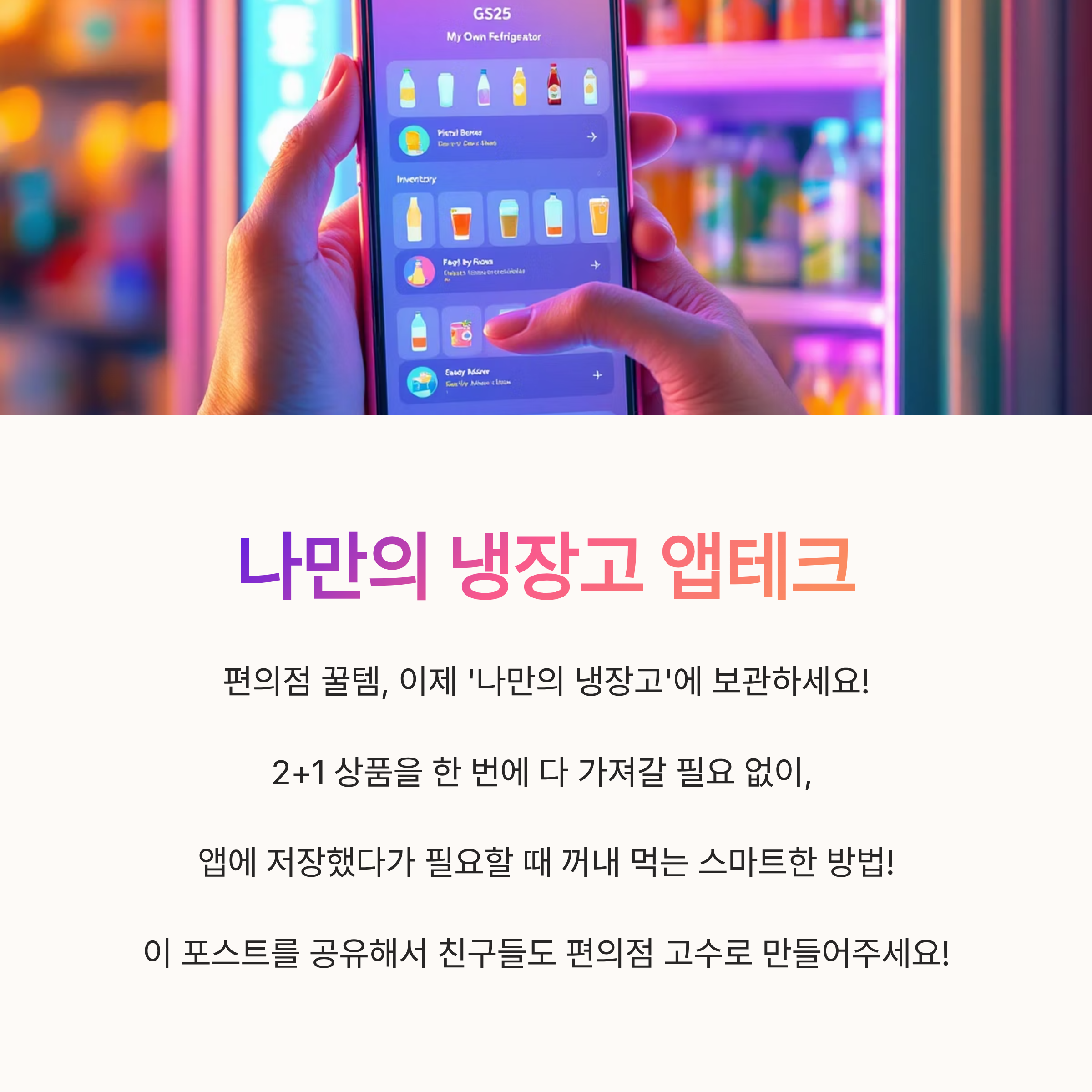 - GS25 '나만의 냉장고': 1+1, 2+1 상품을 구매하고 바로 가져가지 않아도 앱에 보관해 두었다가 나중에 필요한 만큼만 찾아갈 수 있습니다. 유통기한 걱정 NO!
