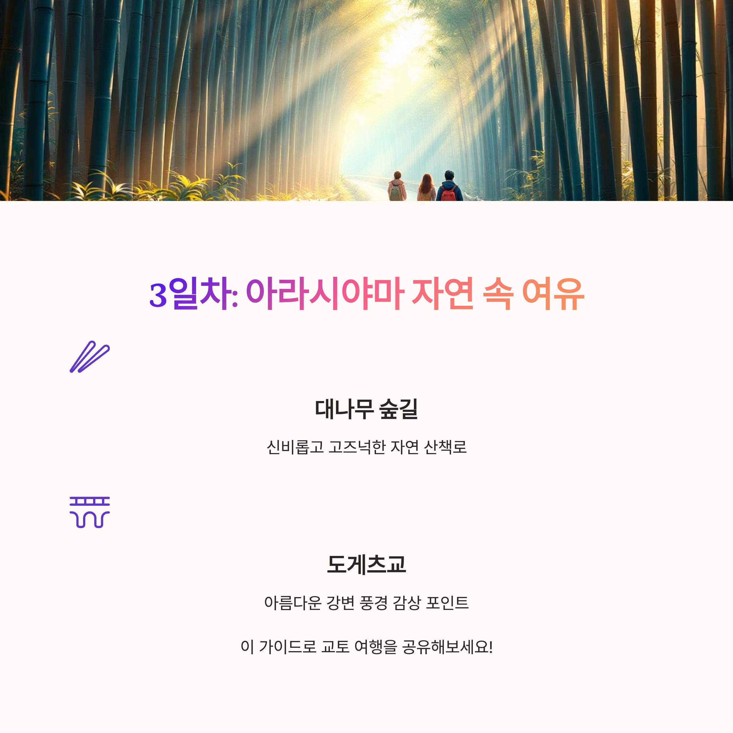 - **오전:** 아라시야마로 이동 → **아라시야마 대나무 숲** 산책 (바람 소리가 예술인 고즈넉한 길) → **덴류지(天龍寺)** 방문 (세계유산이자 아름다운 정원으로 유명한 선종 사찰)