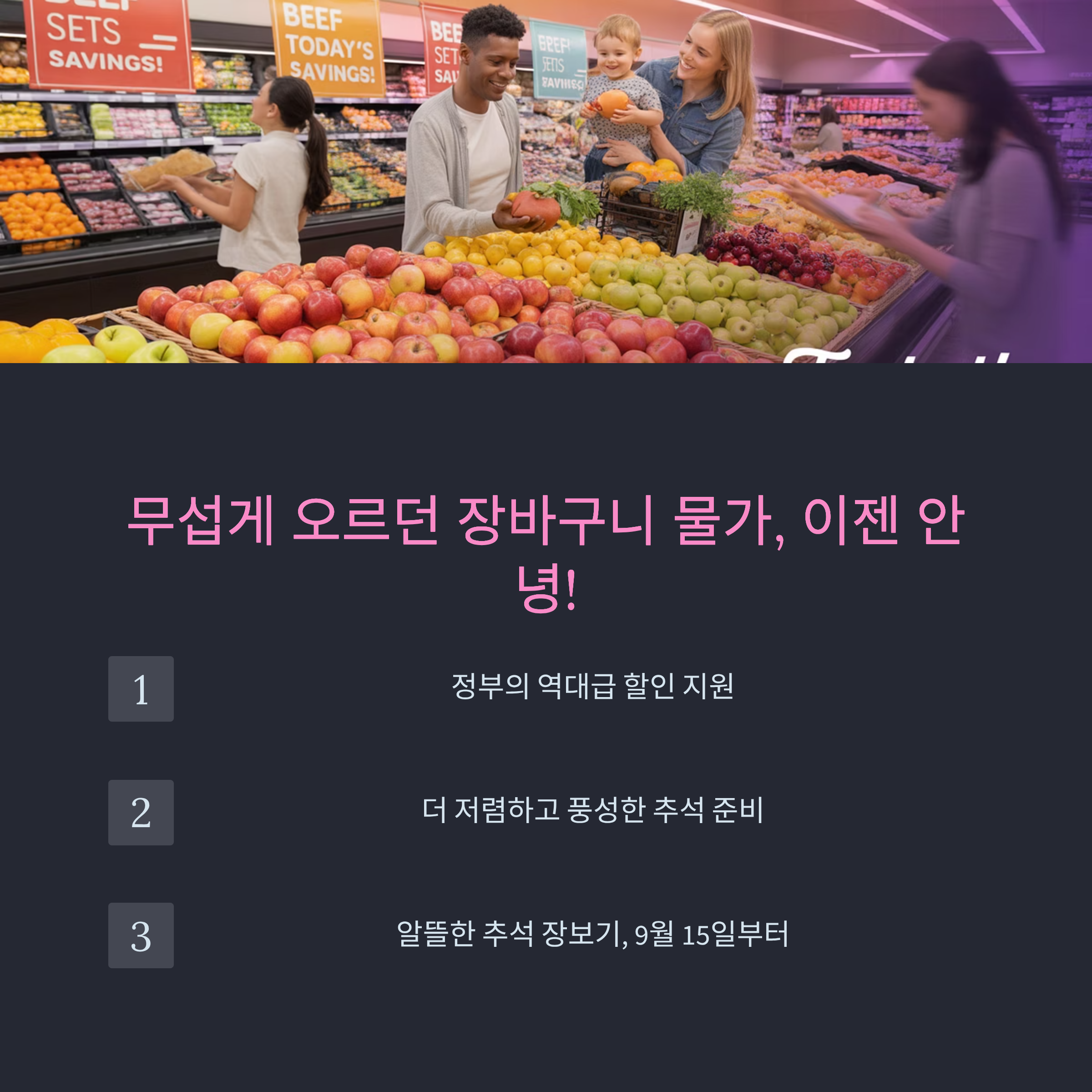 1. 장보기는 9월 15일 이후! '농축수산물 할인대전'을 적극 활용해 장바구니 부담을 줄이세요.
