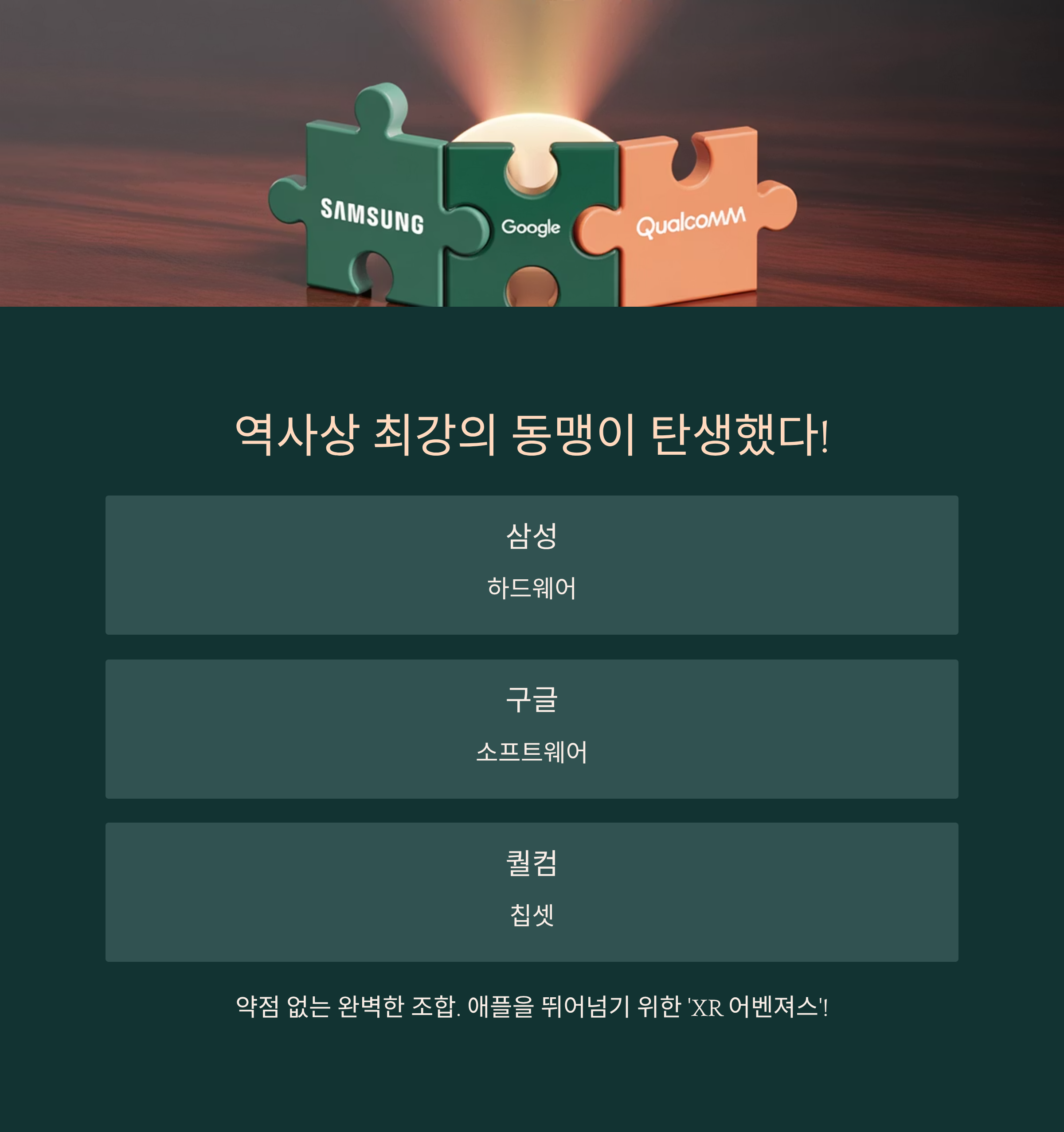 ✅ 구글 (두뇌 & 영혼): XR 기기를 위한 새로운 OS '안드로이드 XR'과 AI 비서 '제미나이'를 탑재해 '두뇌'와 '영혼'을 불어넣어요.