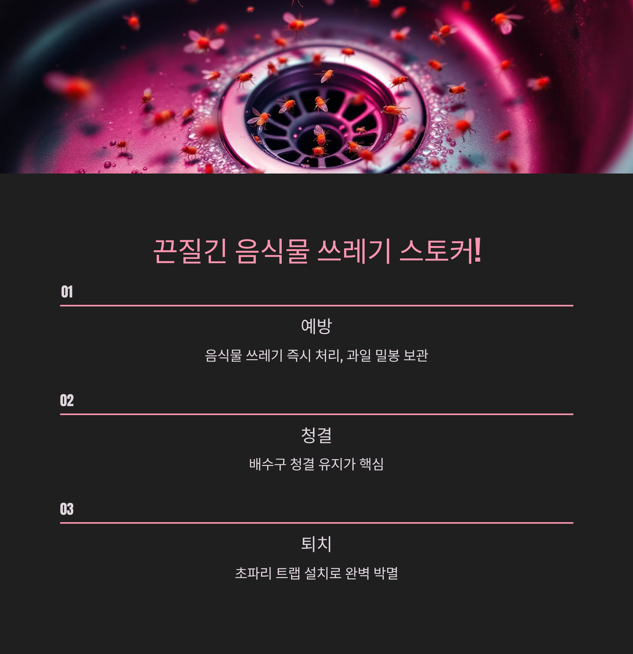 - **[예방] 배수구 청결 유지:** 배수구는 초파리 알이 부화하기 좋은 장소입니다. 뜨거운 물을 붓거나 락스, 베이킹소다 등으로 주기적으로 청소하여 깨끗하게 유지하세요.