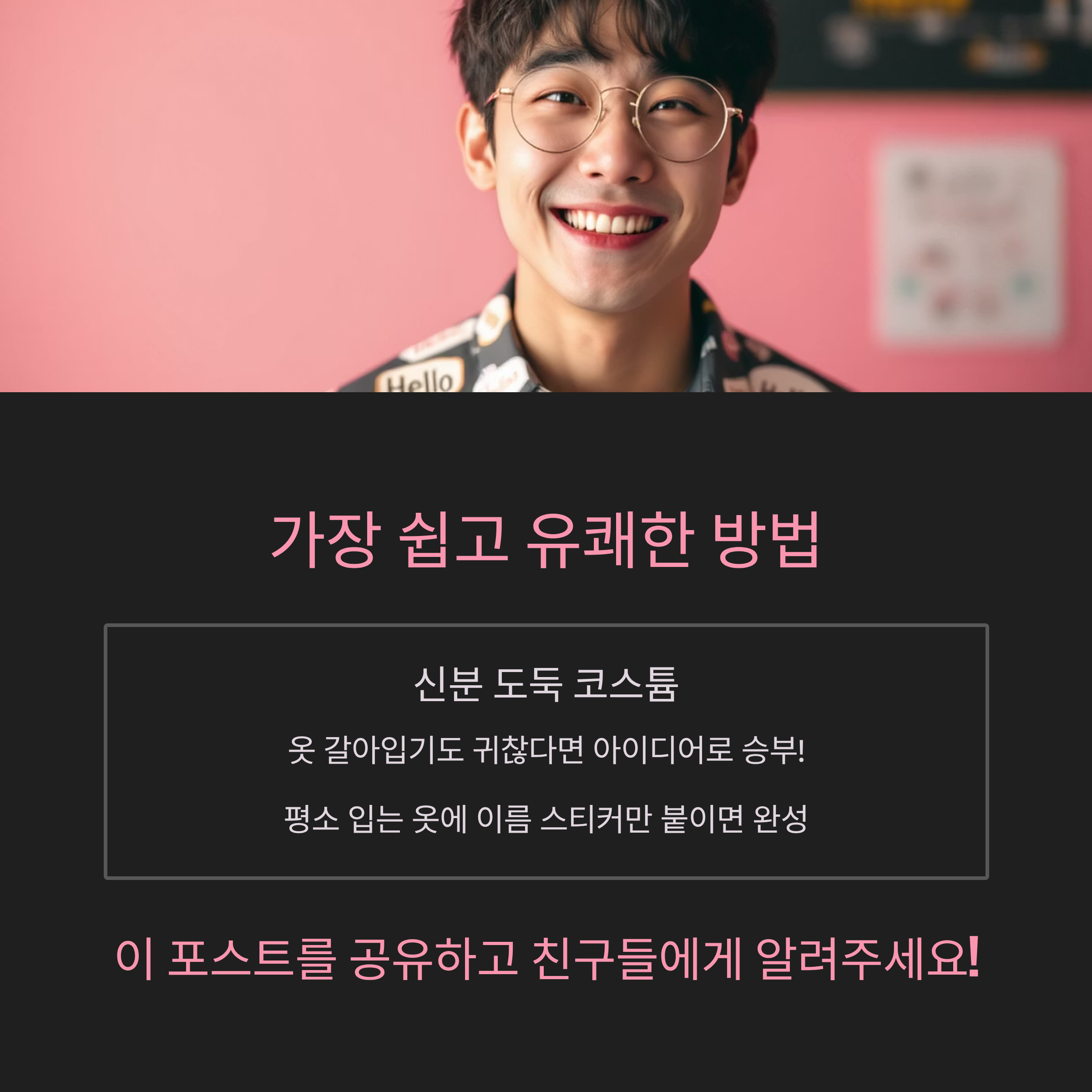 포인트: 스티커에 '철수', '영희', '마이클', '제니퍼' 등 아무 이름이나 잔뜩 써서 온몸에 붙이세요. 가장 저렴하고 유쾌한 코스튬 완성!